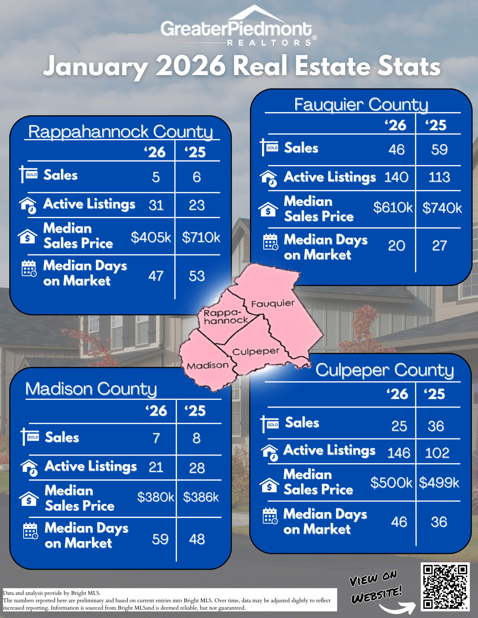 Please find the latest Real Estate stats for Fauquier County for January 2026 with a comparison to January 2025 that reflects Sales Activity, Median Sales Price, Pending Sales, Active Listings, Months of Inventory, Average Days on Market, and New Listings. And comparisons to the other counties in the Greater Piedmont footprint. CLICK HERE FOR THE COMPLETE REPORT.